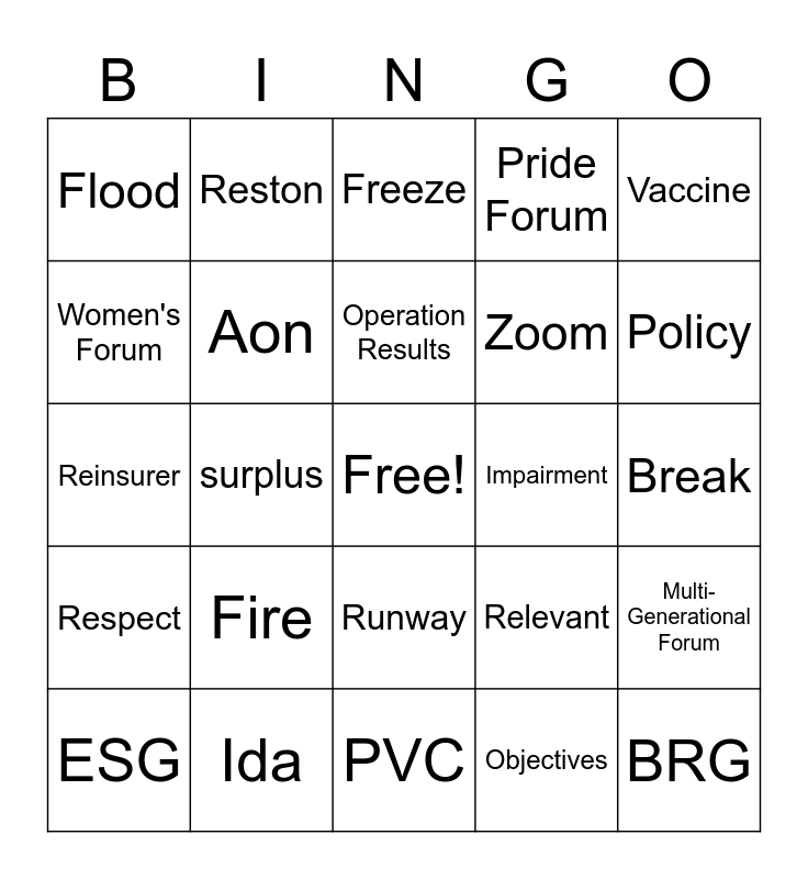 This bingo card has a free space and 29 words: ESG, sustainability, surplus, organic growth, Flood, Freeze, Aon, Fire, Impairment, Ida, Break, BRG, PVC, Objectives, Policy, Resilience, Runway, Respect, Vaccine, Reinsurer, Relevant, Partnership, Zoom, Women's Forum, Pride Forum, Reston, Multi-Generational Forum, Operation Results and COVID.