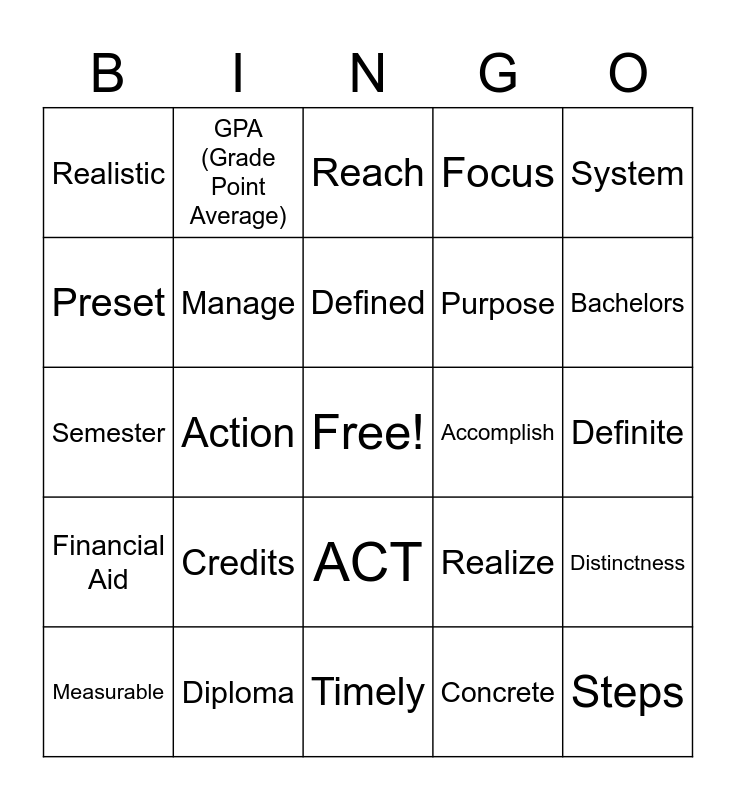 This bingo card has a free space and 55 words: Specific, Measurable, Action-Oriented, Realistic, Timely, Organize, Manage, Plan, Purpose, Guide, Focus, Confidence, Ambition, Challenge, Determination, Process, System, Action, Course, Steps, Accomplish, Success, Realize, Reach, Aim, Defined, Concrete, Clearness, Definite, Distinctness, Satisfy, Acquire, Objective, Strategic, Preset, Semester, Major, Financial Aid, Graduate, Scholarship, GPA (Grade Point Average), Extra-Curricular, Core Content, Elective, Credits, Diploma, Degree, Certificate, License, Bachelors, College, Trade, SAT, ACT and TSI.
