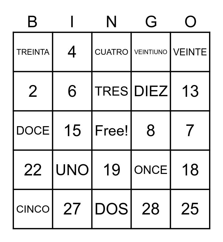 This bingo card has a free space and 25 words: UNO, DOS, TRES, CINCO, VEINTE, TREINTA, 2, 4, 8, 19, DIEZ, DOCE, ONCE, 18, 6, 9, 7, CUATRO, 13, 15, 25, 27, 22, VEINTIUNO and 28.