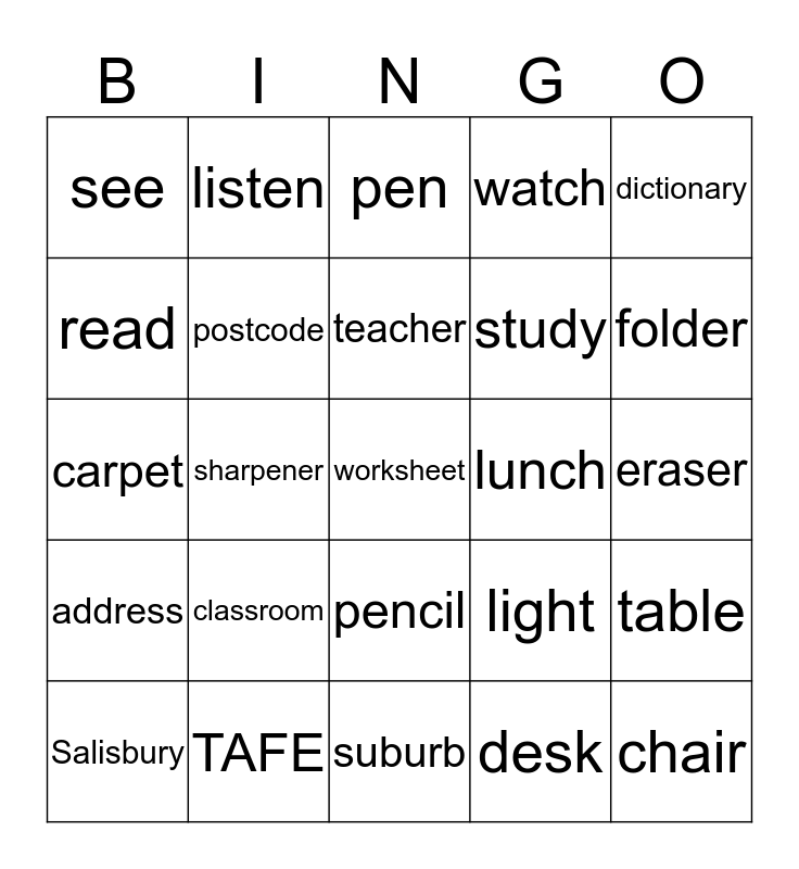 This bingo card has a free space and 42 words: student, teacher, English, classroom, desk, table, chair, whiteboard, pen, pencil, eraser, folder, sharpener, dictionary, computer, light, floor, carpet, speak, listen, read, write, talk, see, hear, learn, study, homework, letter, number, name, address, postcode, suburb, phone, Salisbury, TAFE, lunch, start, finish, watch and book.