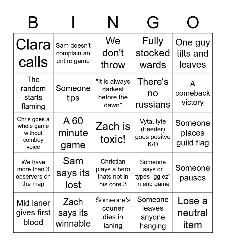 This bingo card has a free space and 24 words: Sam says its lost, Zach says its winnable, "It is always darkest before the dawn", Mid laner gives first blood, One guy tilts and leaves, Clara calls, The random starts flaming, Sam doesn't complain an entire game, Vytautyte (Feeder) goes positve K/D, Christian plays a hero thats not in his core 3, There's no russians, Chris goes a whole game without comboy voice, Someone says or types "gg ez" in end game, Someone pauses, Someone tips, Someone leaves anyone hanging, Someone places guild flag, We don't throw, A comeback victory, A 60 minute game, Lose a neutral item, We have more than 3 observers on the map, Fully stocked wards and Someone's courier dies in laning.