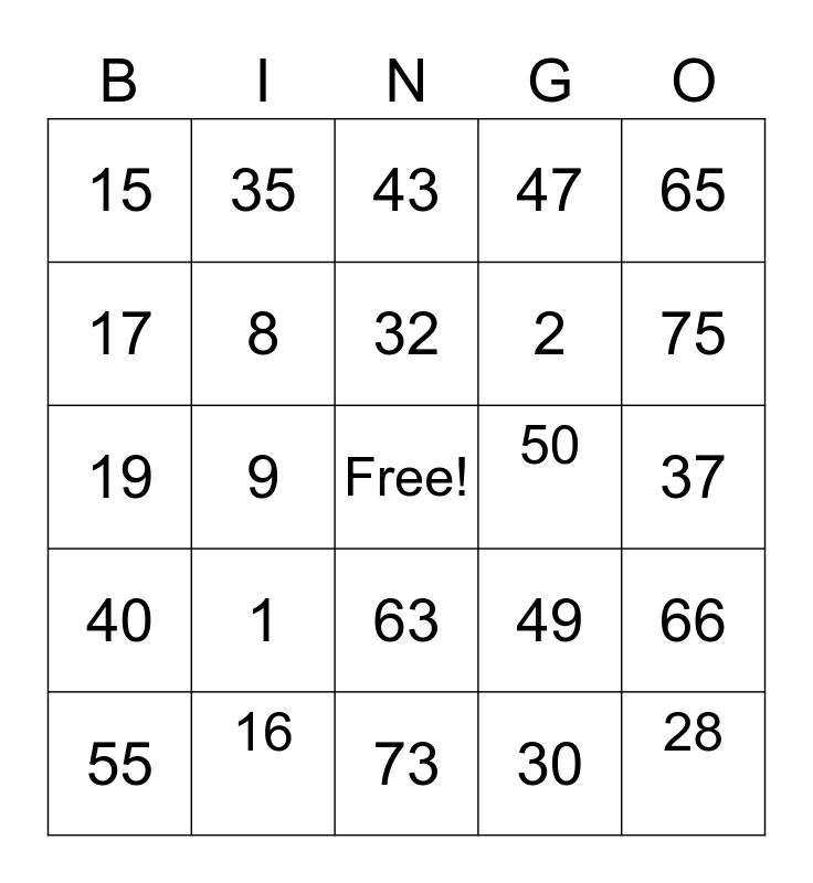 This bingo card has a free space and 24 words: 1, 16, 32, 55, 65, 15, 17, 35, 50, 63, 2, 19, 49, 66, 8, 30, 37, 43, 75, 9, 28, 40, 47 and 73.