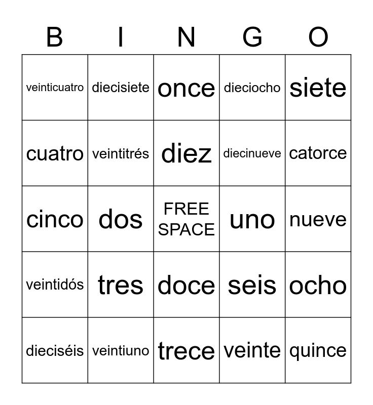 This bingo card has a free space and 24 words: tres, veintiuno, diez, dieciséis, siete, veinticuatro, cuatro, diecisiete, uno, doce, diecinueve, cinco, seis, ocho, veintitrés, veinte, nueve, once, catorce, dos, quince, veintidós, dieciocho and trece.
