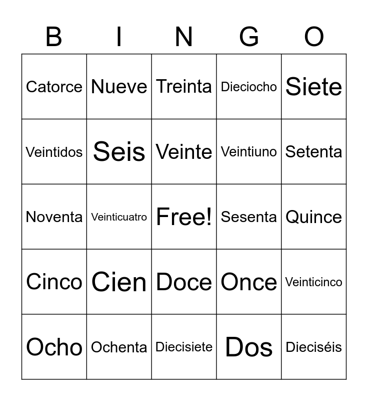 This bingo card has a free space and 34 words: Uno, Dos, Tres, Cuatro, Cinco, Seis, Siete, Ocho, Nueve, Diez, Veinte, Treinta, Cuarenta, Cincuenta, Sesenta, Setenta, Ochenta, Noventa, Cien, Once, Doce, Trece, Catorce, Quince, Diecisiete, Dieciséis, Dieciocho, Diecinueve, Veintiuno, Veintidos, Veintitrés, Veinticuatro, Veinticinco and Cero.