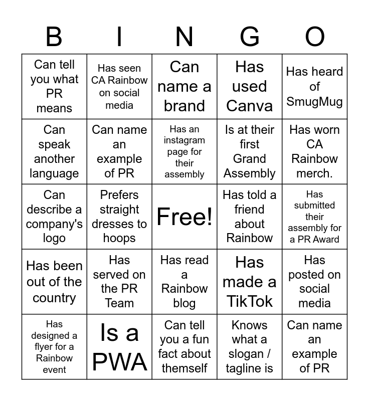 This bingo card has a free space and 24 words: Has served on the PR Team, Is a PWA, Has an instagram page for their assembly, Has designed a flyer for a Rainbow event, Has heard of SmugMug, Can tell you what PR means, Can speak another language, Has seen CA Rainbow on social media, Has told a friend about Rainbow, Has read a Rainbow blog, Is at their first Grand Assembly, Can describe a company's logo, Has made a TikTok, Has posted on social media, Can name an example of PR, Knows what a slogan / tagline is, Has submitted their assembly for a PR Award, Can name a brand, Has worn CA Rainbow merch., Prefers straight dresses to hoops, Can name an example of PR, Has been out of the country, Has used Canva and Can tell you a fun fact about themself.