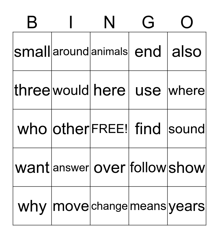 This bingo card has a free space and 24 words: answer, move, here, why, also, small, three, around, find, over, use, who, follow, show, would, means, sound, animals, where, other, years, want, end and change.