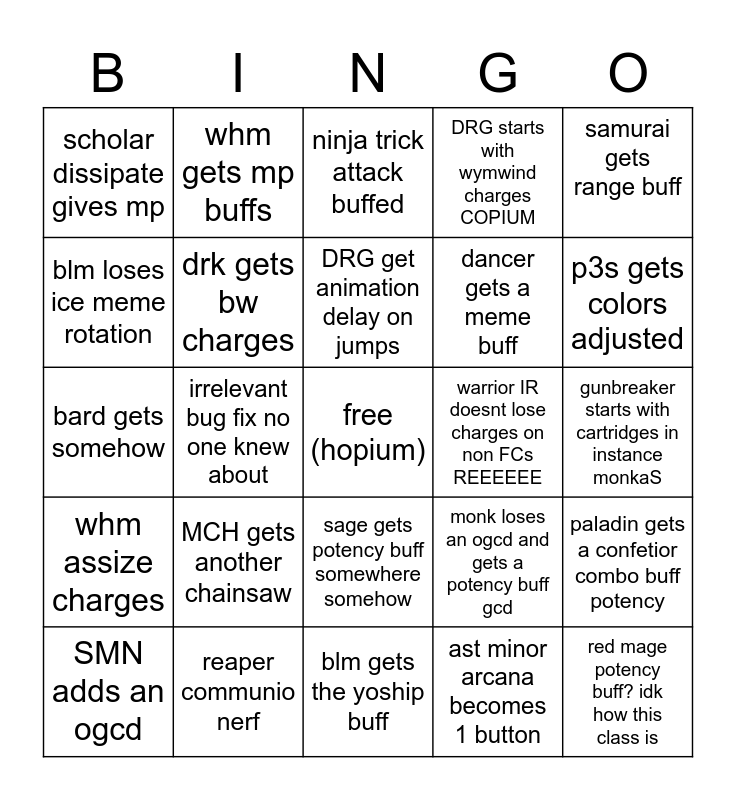 This bingo card has a free space and 24 words: MCH gets another chainsaw, reaper communio nerf, DRG get animation delay on jumps, SMN adds an ogcd, samurai gets range buff, scholar dissipate gives mp, blm loses ice meme rotation, whm gets mp buffs, warrior IR doesnt lose charges on non FCs REEEEEE, sage gets potency buff somewhere somehow, dancer gets a meme buff, bard gets somehow, monk loses an ogcd and gets a potency buff gcd, paladin gets a confetior combo buff potency, drk gets bw charges, ast minor arcana becomes 1 button, gunbreaker starts with cartridges in instance monkaS, ninja trick attack buffed, p3s gets colors adjusted, irrelevant bug fix no one knew about, red mage potency buff? idk how this class is, whm assize charges, DRG starts with wymwind charges COPIUM and blm gets the yoship buff.