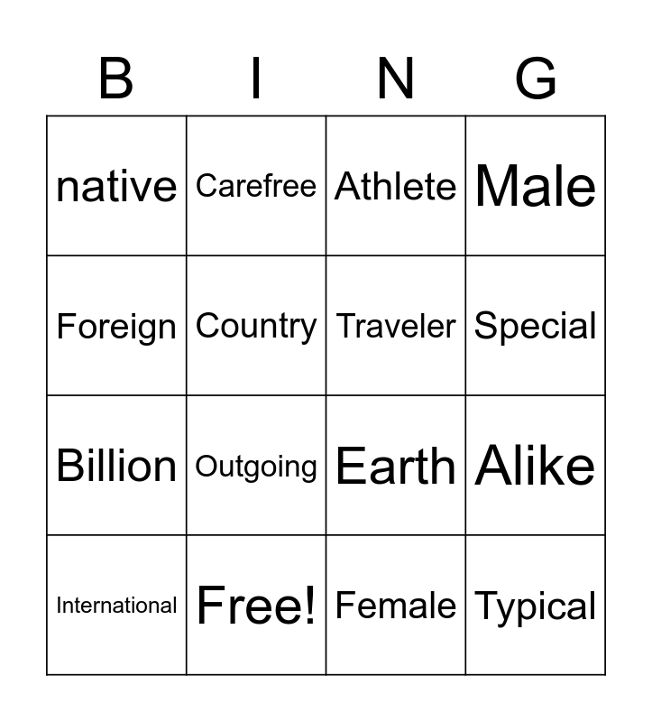 This bingo card has 16 words: Free!, Alike, Athlete, native, Billion, Carefree, Earth, Female, Foreign, Country, International, Male, Outgoing, Special, Traveler and Typical.