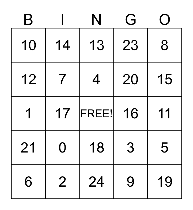 This bingo card has a free space and 24 words: 0, 2, 4, 6, 8, 10, 12, 14, 16, 18, 20, 1, 3, 5, 7, 9, 11, 13, 15, 17, 19, 21, 23 and 24.