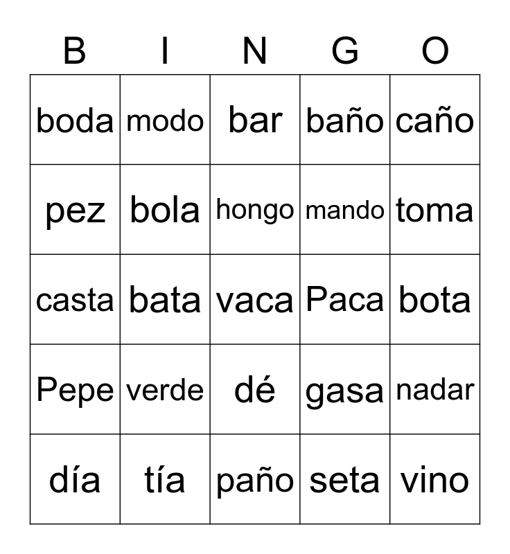 This bingo card has 38 words: Free!, tumba, lobo, bola, nadar, verde, hongo, casa, caño, mando, bata, baño, vaca, bota, pez, Pepe, beso, bar, par, Paca, boda, tía, toma, día, mango, paño, vino, pino, boca, poca, té, dé, seta, modo, moto, gasa, casta and gasta.