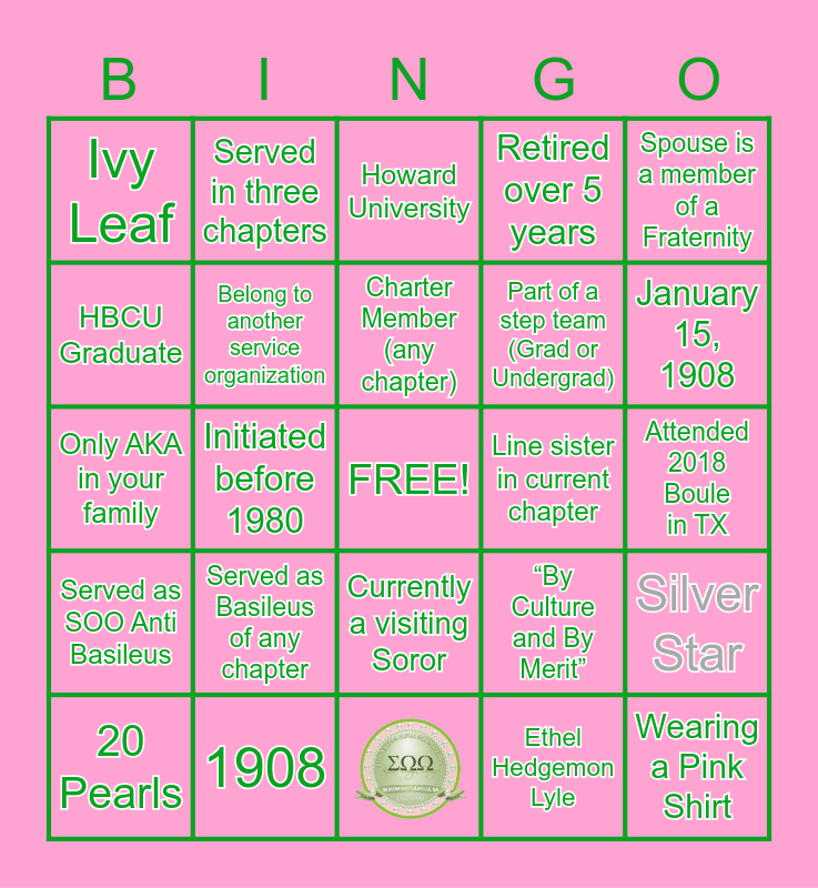 This bingo card has 1 images, a free space and 37 words: SOO SOARS, Attended 2017 Regional Conference, Apple Green, Line sister in current chapter, Attended 2018 Boule in TX, 20 Pearls, Initiated before 1980, Legacy, Part of a step team (Grad or Undergrad), Spouse is a member of a Fraternity, Only AKA in your family, Belong to another service organization, Life Member, January 15, 1908, HBCU Graduate, Served as Basileus of any chapter, Currently a visiting Soror, Retired over 5 years, Been a member of more than one Region, Served as SOO Anti Basileus, Served in three chapters, Charter Member (any chapter), “By Culture and By Merit”, Silver Star, Pink Tea Rose, Building Your Economic Legacy, SOO Initiated, HBCU 4 Life, The Arts!, Women’s Healthcare & Wellness, Golden Soror, Wearing a Pink Shirt, Ivy Leaf, 1908, Howard University, Ethel Hedgemon Lyle and #CAP.