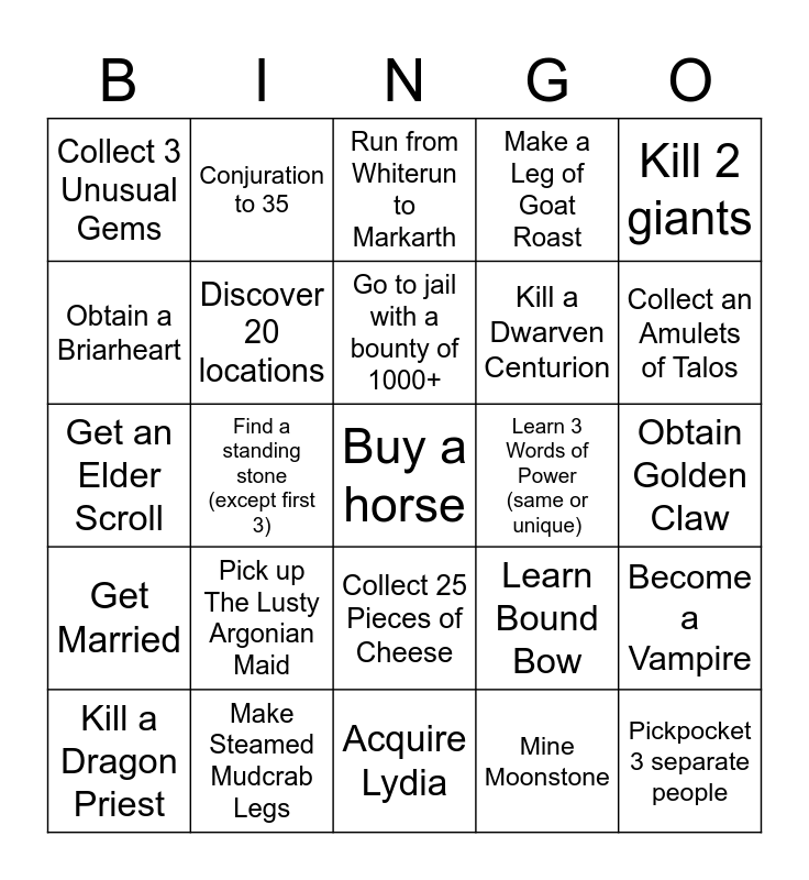 This bingo card has 52 words: Free!, Buy a horse, Gain 2 Dragon Souls, Acquire Lydia, Pick up The Lusty Argonian Maid, Escape from jail, Conjuration to 35, Eat a Human Heart, Obtain a Briarheart, Buy Breezehome, Discover 20 locations, Become a Werewolf, Become a Vampire, Learn Bound Bow, Acquire 7000 gold, Win a travern brawl, Go to jail with a bounty of 1000+, Learn 3 Words of Power (same or unique), Discover all hold capitals, Kill 2 giants, Find a standing stone (except first 3), Mine Moonstone, Collect 3 Unusual Gems, Kill a Dwarven Centurion, Fus Ro Dah!, Pickpocket 3 separate people, Obtain The Mace of Molag Bal, Collect an Amulet of Mara, Collect an Amulets of Talos, Collect 15 Sweetrolls, Pay 3 Different Bards, Make a Leg of Goat Roast, Go to Fort Dawnguard, Create any one Stew, Kill 3 Civilians, Run from Whiterun to Markarth, Make Steamed Mudcrab Legs, Go to Raven Rock, Collect any piece of Glass Armour, Clear a Embershard Mine, Kill a Spriggan, Obtain Golden Claw, Get Married, Get all 3 Words of Unrelenting Force, Collect 25 Pieces of Cheese, Collect any Piece of Ebony Armour, Collect 25 Tankards, Get an Elder Scroll, Run from Windhelm to Riften, Become Thane of Whiterun, Kill a Dragon Priest and Obtain 25 Deathbell Flowers.