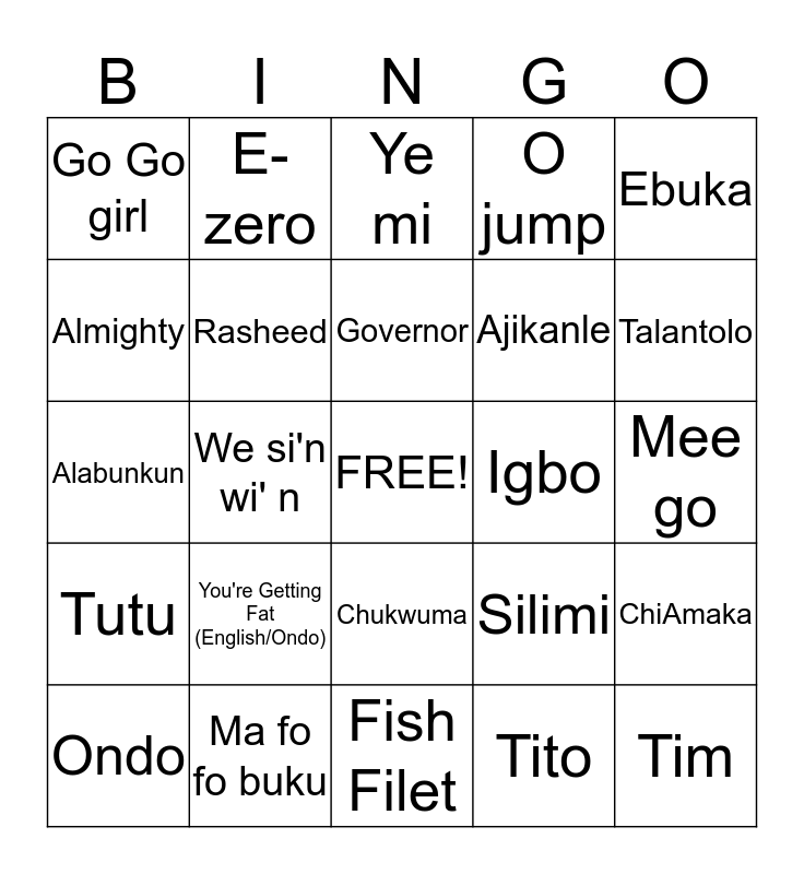 This bingo card has a free space and 24 words: You're Getting Fat (English/Ondo), Ma fo fo buku, Governor, Ondo, Ebuka, Go Go girl, Almighty, E-zero, Igbo, Chukwuma, Ajikanle, Alabunkun, Silimi, ChiAmaka, Rasheed, Tito, Mee go, Ye mi, Talantolo, We si'n wi' n, Tim, Tutu, O jump and Fish Filet.