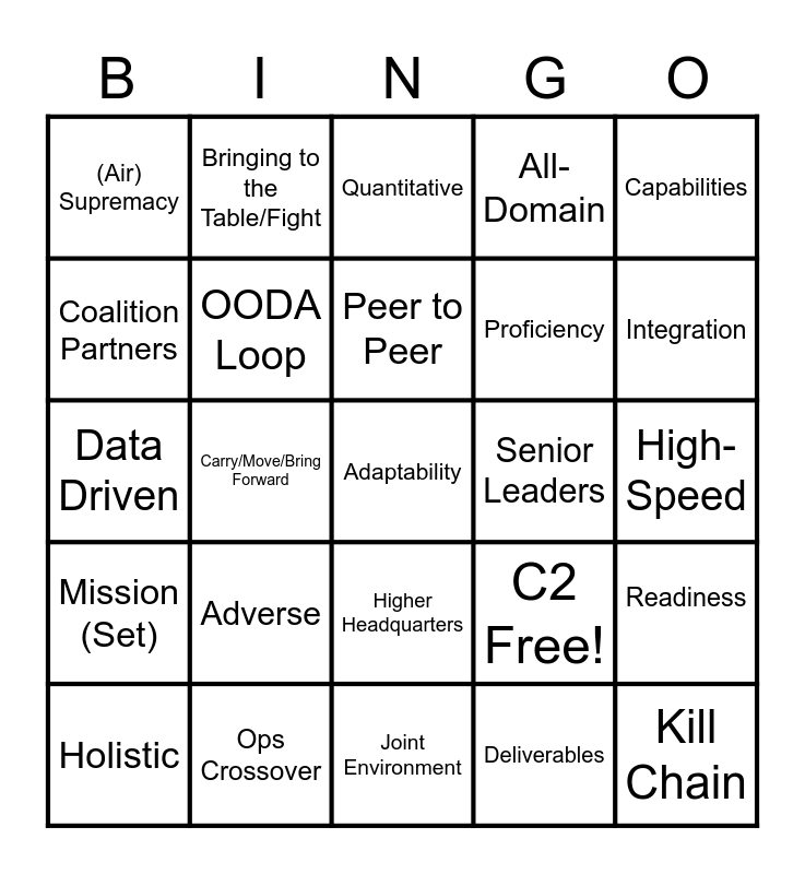 This bingo card has 25 words: Adverse, Joint Environment, Peer to Peer, Holistic, Capabilities, (Air) Supremacy, Coalition Partners, Bringing to the Table/Fight, Senior Leaders, Higher Headquarters, Proficiency, Data Driven, C2 Free!, Readiness, OODA Loop, Kill Chain, High-Speed, Quantitative, Integration, Carry/Move/Bring Forward, Adaptability, Ops Crossover, Mission (Set), All-Domain and Deliverables.