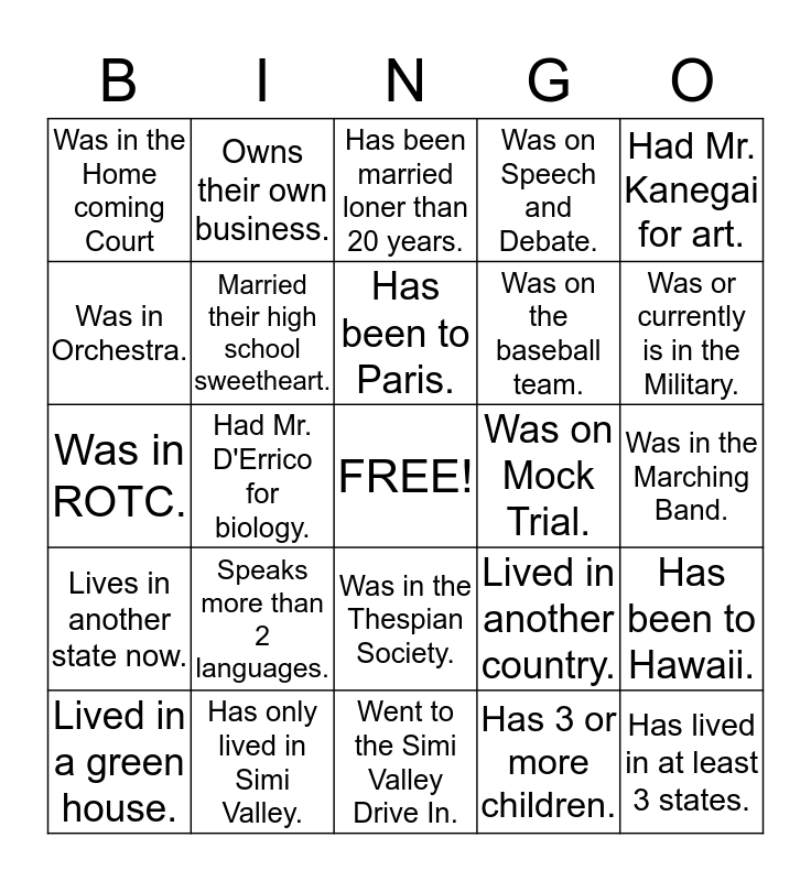This bingo card has a free space and 24 words: Speaks more than 2 languages., Has only lived in Simi Valley., Has been to Paris., Lived in a green house., Had Mr. Kanegai for art., Was in the Home coming Court, Was in Orchestra., Owns their own business., Was on Mock Trial., Was in the Thespian Society., Was on the baseball team., Was in ROTC., Lived in another country., Has been to Hawaii., Married their high school sweetheart., Has 3 or more children., Was in the Marching Band., Has been married loner than 20 years., Was or currently is in the Military., Had Mr. D'Errico for biology., Has lived in at least 3 states., Lives in another state now., Was on Speech and Debate. and Went to the Simi Valley Drive In..