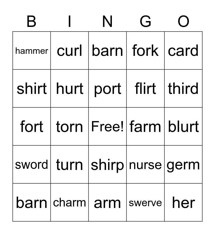 This bingo card has a free space and 24 words: turn, charm, port, barn, card, hammer, shirt, curl, farm, shirp, flirt, fort, nurse, germ, hurt, swerve, blurt, barn, third, torn, her, sword, fork and arm.