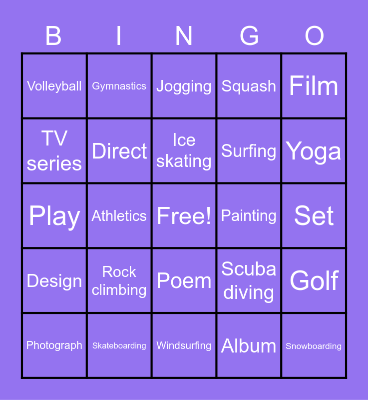 This bingo card has a free space and 32 words: Album, Architecture, Athletics, Classical music, Design, Direct, Film, Golf, Gymnastics, Ice hockey, Ice skating, Jogging, Novel, Paint, Painting, Perform, Photograph, Play, Poem, Rock climbing, Scuba diving, Sculpture, Set, Skateboarding, Snowboarding, Squash, Surfing, TV series, Volleyball, Windsurfing, Write and Yoga.