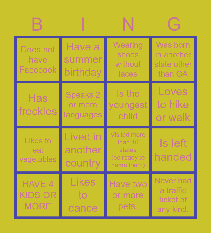 This bingo card has 16 words: Likes to dance, Is left handed, Wearing shoes without laces, Does not have Facebook, Likes to eat vegetables, Have a summer birthday, Visited more than 10 states (be ready to name them), Have two or more pets., Has freckles, Speaks 2 or more languages, HAVE 4 KIDS OR MORE, Was born in another state other than GA, Lived in another country, Loves to hike or walk, Is the youngest child and Never had a traffic ticket of any kind..