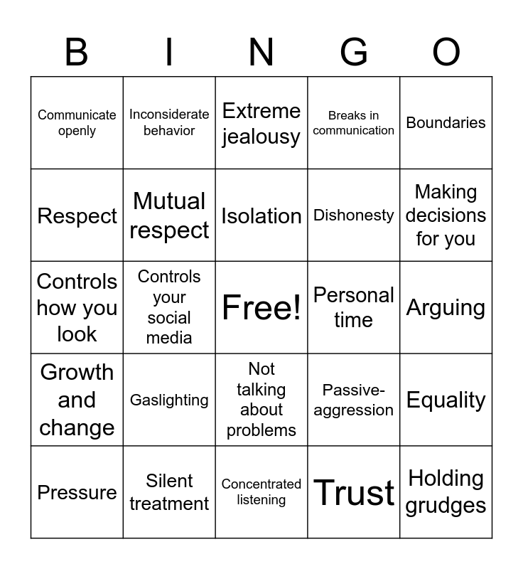 This bingo card has a free space and 30 words: Silent treatment, Encourages your passions, Controls your social media, Open and honest, Communicate openly, Extreme jealousy, Mutual respect, Not talking about problems, Personal time, Concentrated listening, Arguing, Holding grudges, Trust, Needing constant update, Making decisions for you, Fixing someone, Passive-aggression, Growth and change, Gaslighting, Boundaries, Controls how you look, Shifts blame, Inconsiderate behavior, Dishonesty, Respect, Breaks in communication, Equality, Pressure, Isolation and Manipulation.