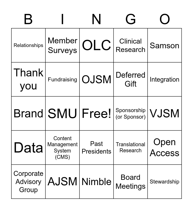 This bingo card has a free space and 84 words: Annual Meeting, Exhibits, OLC, Specialty Day, Surgical Skills, CME, Fellowship, Logistics, Accreditation, E-learning, Faculty (or Speakers), Hotels, Fundraising, Sponsorship (or Sponsor), Benefits, Relationships, Corporate Advisory Group, Thank you, #GivingTuesday, Linkage, Ability, Interest, Restricted Gift, Deferred Gift, Stewardship, Schedule, SMU, Action and Updates, Landing Page, Banner, PDF, Jpeg, Content Management System (CMS), Hootsuite, Informz, Brand, Logo, Association Management System/Software, Nimble, Single Sign-on (SSO), Integration, Data, My printer isn’t working!, Cookie, Business Intelligence (BI), Firewall, Phishing, Research Grant, Member Surveys, Patient Reported Outcomes, Multicenter Trial, Randomized Controlled Trial (RCT), Basic Science Research, Translational Research, Clinical Research, Study Section, National Institutes of Health (NIH), National Institute of Arthritis and Musculoskeletal and Skin Diseases (NIAMS), AJSM, OJSM, Sports Health, VJSM, Bench Press, Easy Reider, PubMed, AMA Style, Peer Review, Cas, Odin, Thibault, Samson, Impact Factor, Open Access, Presidential Line, Board of Directors, BoardEffect, Past Presidents, Board Meetings, Ex-oficio, Kurt P. Spindler, MD, President, Compliance with Labor Laws, Selection Process, Rise, Perform Yard Assignee, Postal Pro and Myfaxcentral.