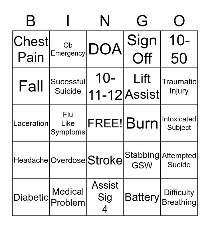 This bingo card has a free space and 24 words: Overdose, Medical Problem, 10-11-12, Diabetic, 10-50, Chest Pain, Fall, Ob Emergency, Burn, Stroke, Lift Assist, Laceration, Stabbing GSW, Attempted Sucide, Sucessful Suicide, Battery, Intoxicated Subject, DOA, Traumatic Injury, Flu Like Symptoms, Difficulty Breathing, Headache, Sign Off and Assist Sig 4.