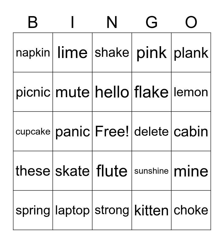 This bingo card has a free space and 24 words: skate, laptop, hello, spring, plank, napkin, picnic, lime, delete, flute, flake, cupcake, sunshine, mine, mute, kitten, cabin, shake, lemon, panic, choke, these, pink and strong.