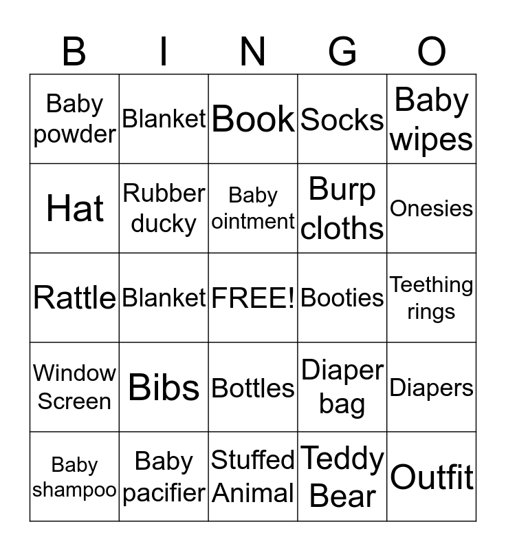 This bingo card has a free space and 24 words: Bibs, Baby pacifier, Baby ointment, Baby shampoo, Baby wipes, Baby powder, Hat, Blanket, Booties, Bottles, Burp cloths, Rattle, Diaper bag, Diapers, Rubber ducky, Teddy Bear, Teething rings, Book, Onesies, Blanket, Outfit, Window Screen, Socks and Stuffed Animal.