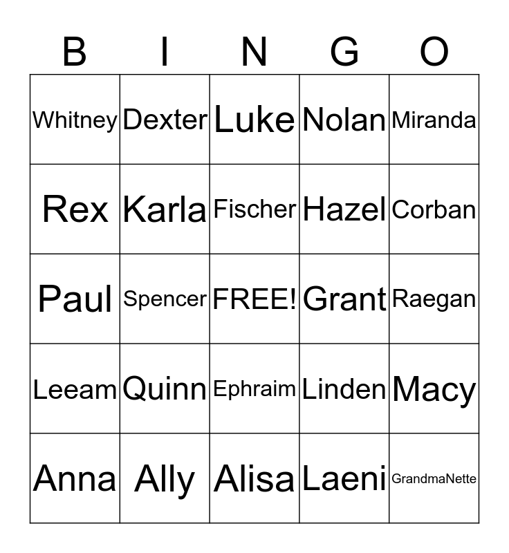 This bingo card has a free space and 48 words: PawPaw, GrandmaNette, Aunt Rose, Alisa, Quinn, Haley, Dexter, Maxwell, Rex, Jeremy, Karla, Nolan, Macy, Linden, Natalie, Mick, Fischer, Grant, Will, Miranda, Spencer, Laeni, Whitney, Hazel, Griffin, Corban, Anna, Olivia, Ephraim, Leeam, Ivie, Heather, Jaimi, West, Ally, Emma, Hazley, Raegan, Tyler, Melanie, Brinlee, Kate, Luke, Tiffany, Paul, Macie, Kayla and Elyssa.