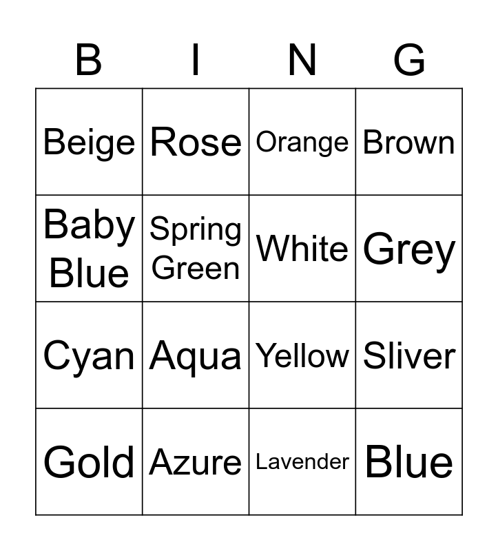 This bingo card has 28 words: Red, Green, Cyan, Magenta, Spring Green, Orange, Rose, Blue, Azure, Pink, Yellow, Brown, Black, Tan, Aqua, Navy Blue, Maroon, White, Grey, Red, Beige, Violet, Gold, Sliver, Lavender, Ultra, Baby Blue and Emerald.