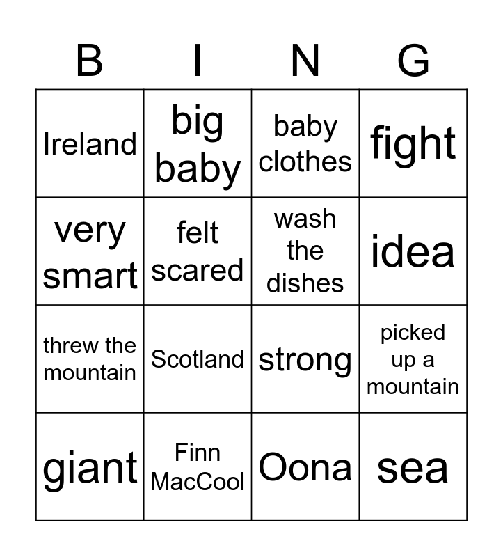 This bingo card has 16 words: Finn MacCool, picked up a mountain, baby clothes, Ireland, threw the mountain, big baby, strong, Oona, very smart, felt scared, giant, fight, Scotland, idea, wash the dishes and sea.