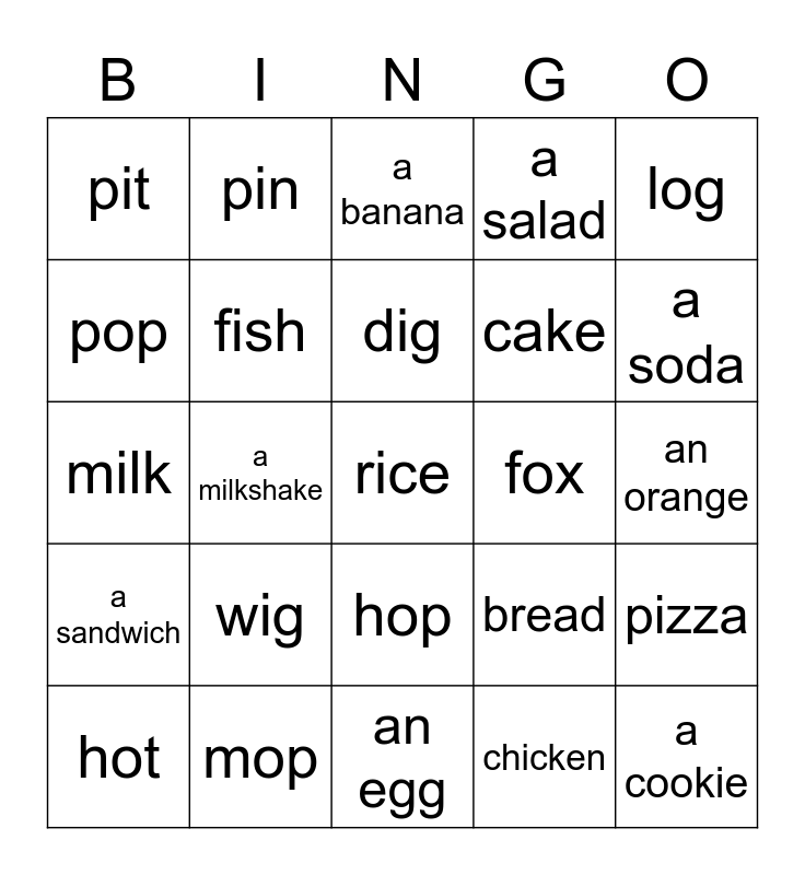 This bingo card has a free space and 24 words: wig, mop, dig, hot, log, pit, pop, pin, fox, hop, cake, milk, bread, pizza, fish, chicken, an orange, a banana, a soda, a milkshake, a cookie, a sandwich, a salad and an egg.
