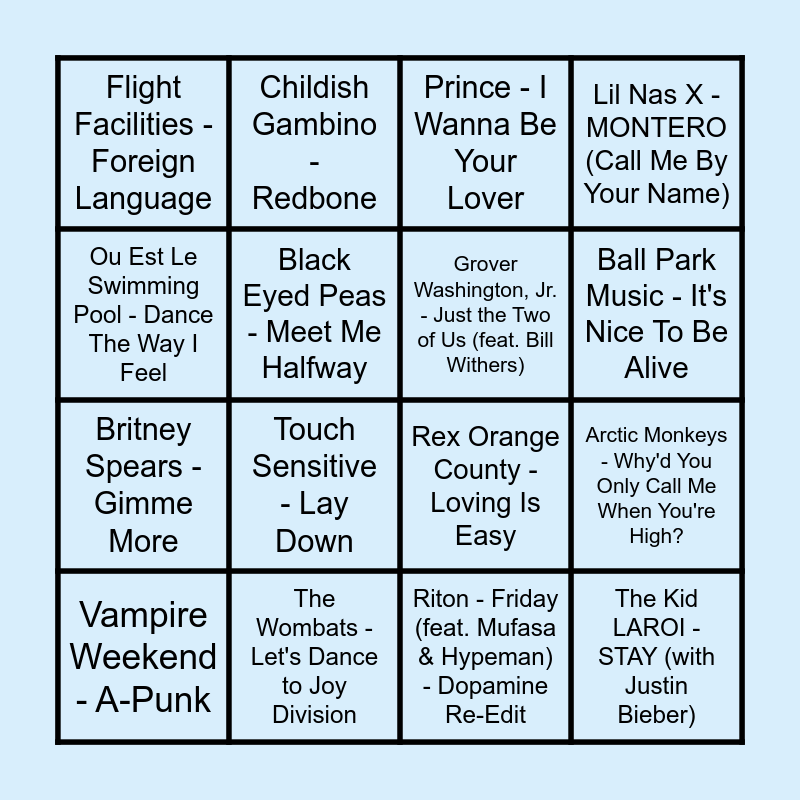 This bingo card has 61 words: Earth, Wind & Fire - Let's Groove, Rockwell - Somebody's Watching Me, Glass Animals - Heat Waves, The Kid LAROI - STAY (with Justin Bieber), Lil Nas X - INDUSTRY BABY (feat. Jack Harlow), Gym Class Heroes - Cupid's Chokehold / Breakfast in America, Grover Washington, Jr. - Just the Two of Us (feat. Bill Withers), Doja Cat - Kiss Me More (feat. SZA), Britney Spears - Gimme More, Kid Cudi - Day 'N' Nite (Nightmare), Lil Nas X - MONTERO (Call Me By Your Name), Olivia Rodrigo - good 4 u, Black Eyed Peas - Meet Me Halfway, MGMT - Electric Feel, Client Liaison - World Of Our Love, Flight Facilities - Foreign Language, Vampire Weekend - A-Punk, Ou Est Le Swimming Pool - Dance The Way I Feel, Florence + The Machine - Dog Days Are Over, Ball Park Music - It's Nice To Be Alive, The Wombats - Let's Dance to Joy Division, Prince - I Wanna Be Your Lover, Room 5 - Make Luv, Madonna - Holiday, Post Malone - Congratulations, Kendrick Lamar - King Kunta, Kanye West - Stronger, Nelly Furtado - Maneater, Touch Sensitive - Lay Down, Gang of Youths - Magnolia, Flume - Never Be Like You, Chet Faker - Talk Is Cheap, Kanye West - Runaway, M83 - Midnight City, Childish Gambino - Redbone, Disclosure - Latch, Kendrick Lamar - HUMBLE., Arctic Monkeys - Why'd You Only Call Me When You're High?, J. Cole - No Role Modelz, Rex Orange County - Loving Is Easy, THE ANXIETY - Meet Me At Our Spot, The Weeknd - Blinding Lights, Riton - Friday (feat. Mufasa & Hypeman) - Dopamine Re-Edit, Justin Bieber - Peaches (feat. Daniel Caesar & Giveon), Rihanna - We Found Love, Tears For Fears - Everybody Wants To Rule The World, Gorillaz - Feel Good Inc., Far East Movement - Like A G6, Camila Cabello - Havana (feat. Young Thug), Joel Corry - Head & Heart (feat. MNEK), Gloria Gaynor - I Will Survive - Single Version, Genesis Owusu - Good Times, Michael Jackson - Thriller - Single Version, Elton John - Cold Heart - PNAU Remix, ACRAZE - Do It To It, Frank Ocean - Lost, Yothu Yindi - Treaty, Doja Cat - Need to Know, bbno$ - edamame (feat. Rich Brian), Luude - Down Under (feat. Colin Hay) and The Wiggles - Elephant - triple j Like A Version.
