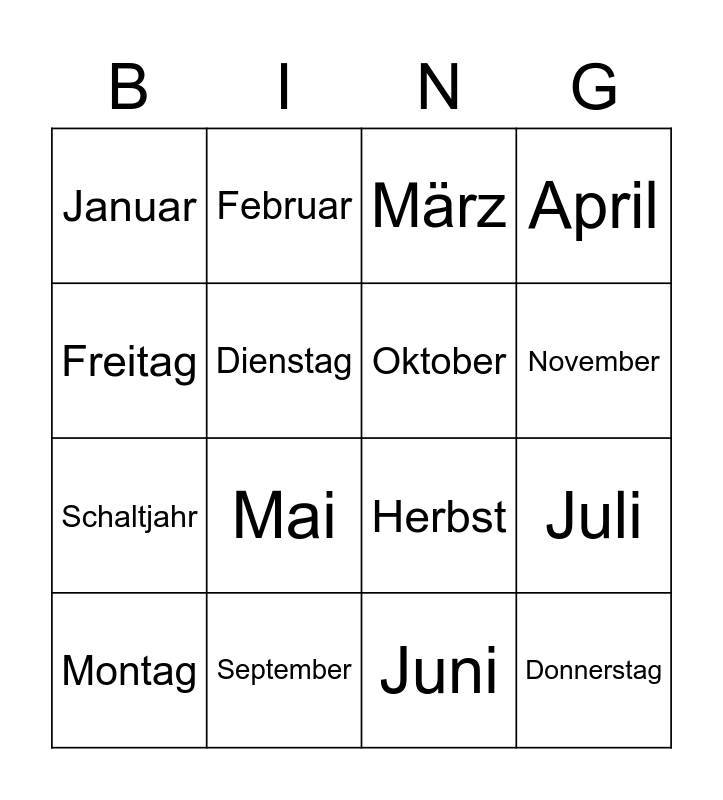 This bingo card has 25 words: Frühling, Sommer, Herbst, Winter, Januar, Februar, März, April, Schaltjahr, Mai, Juni, Juli, August, September, Oktober, Dezember, Montag, Dienstag, Mittwoch, Donnerstag, Freitag, Samstag, Sonntag, November and Wochenende.