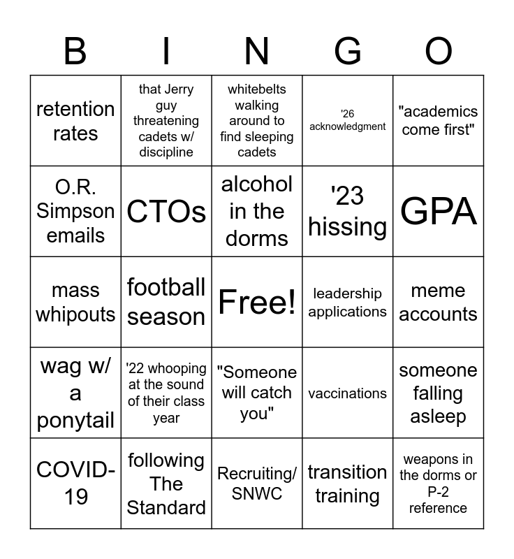 This bingo card has a free space and 24 words: '22 whooping at the sound of their class year, following The Standard, alcohol in the dorms, COVID-19, "academics come first", retention rates, O.R. Simpson emails, that Jerry guy threatening cadets w/ discipline, leadership applications, "Someone will catch you", '23 hissing, mass whipouts, vaccinations, someone falling asleep, CTOs, transition training, meme accounts, whitebelts walking around to find sleeping cadets, GPA, football season, weapons in the dorms or P-2 reference, wag w/ a ponytail, '26 acknowledgment and Recruiting/ SNWC.