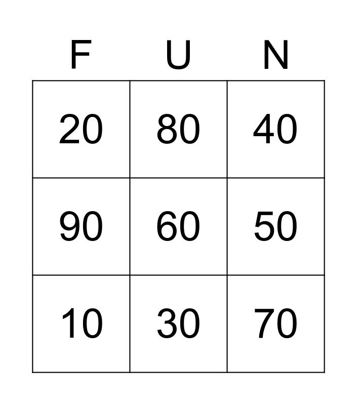 This bingo card has 9 words: 10, 40, 80, 90, 20, 50, 60, 70 and 30.