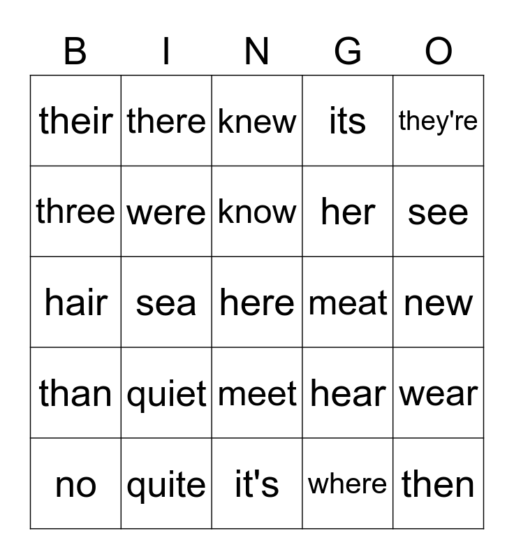 This bingo card has a free space and 24 words: quiet, quite, know, no, they're, their, three, there, meat, meet, her, hair, hear, wear, were, where, new, knew, see, sea, then, than, its and it's.
