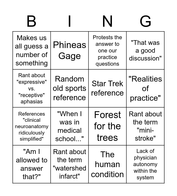 This bingo card has 16 words: Rant about the term "watershed infarct", Rant about the term "mini-stroke", Protests the answer to one our practice questions, Makes us all guess a number of something, References "clinical neuroanatomy ridiculously simplified", Phineas Gage, Forest for the trees, The human condition, Rant about "expressive" vs. "receptive" aphasias, Random old sports reference, "Am I allowed to answer that?", "That was a good discussion", "When I was in medical school...", "Realities of practice", Star Trek reference and Lack of physician autonomy within the system.