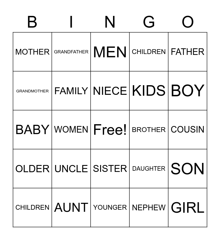 This bingo card has a free space and 24 words: UNCLE, AUNT, NIECE, CHILDREN, FATHER, MOTHER, GRANDMOTHER, GRANDFATHER, BROTHER, SISTER, KIDS, BABY, DAUGHTER, SON, FAMILY, NEPHEW, COUSIN, MEN, BOY, WOMEN, GIRL, OLDER, CHILDREN and YOUNGER.