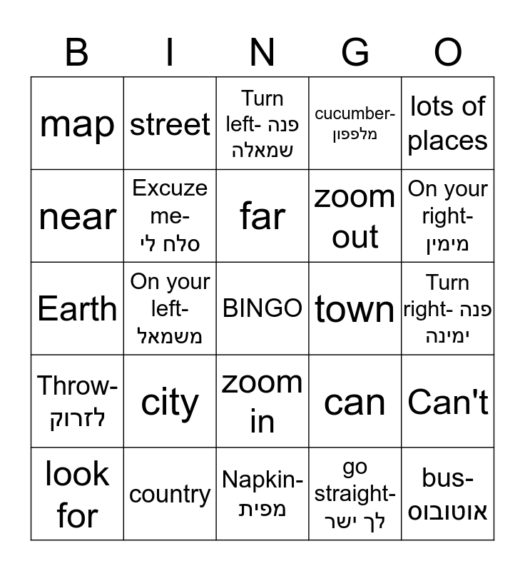 This bingo card has a free space and 24 words: city, country, far, look for, lots of places, map, near, street, town, zoom in, zoom out, Earth, can, Can't, Excuze me- סלח לי, go straight- לך ישר, Turn right- פנה ימינה, Turn left- פנה שמאלה, On your right- מימין, On your left- משמאל, bus- אוטובוס, Throw- לזרוק, cucumber- מלפפון and Napkin- מפית.