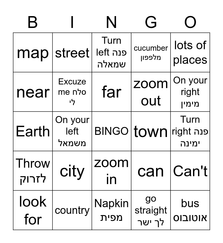 This bingo card has a free space and 24 words: city, country, far, look for, lots of places, map, near, street, town, zoom in, zoom out, Earth, can, Can't, Excuze me סלח לי, go straight לך ישר, Turn right פנה ימינה, Turn left פנה שמאלה, On your right מימין, On your left משמאל, bus אוטובוס, Throw לזרוק, cucumber מלפפון and Napkin מפית.
