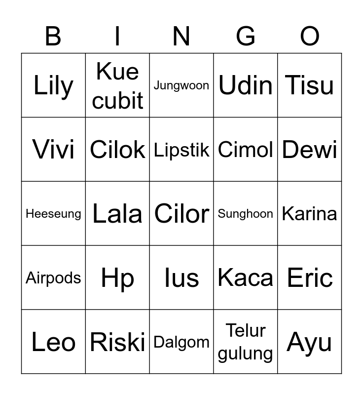 This bingo card has 25 words: Hp, Dalgom, Lipstik, Leo, Tisu, Lily, Vivi, Kue cubit, Sunghoon, Ius, Cimol, Heeseung, Kaca, Eric, Cilok, Ayu, Karina, Jungwoon, Dewi, Lala, Cilor, Riski, Airpods, Udin and Telur gulung.
