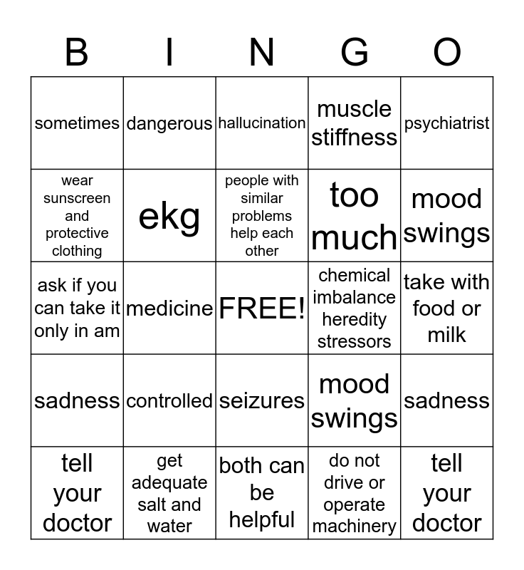 This bingo card has a free space and 24 words: controlled, get adequate salt and water, people with similar problems help each other, tell your doctor, psychiatrist, sometimes, wear sunscreen and protective clothing, dangerous, chemical imbalance heredity stressors, seizures, too much, ask if you can take it only in am, mood swings, sadness, ekg, do not drive or operate machinery, take with food or milk, hallucination, mood swings, medicine, tell your doctor, sadness, muscle stiffness and both can be helpful.