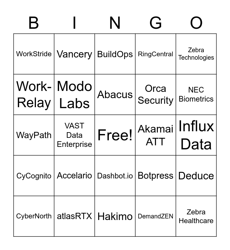 This bingo card has a free space and 58 words: Advantage Communications, atlasRTX, Cloud Advisors, CyCognito, DemandZEN, MicroFocus, Modo Labs, Modo Labs Higher Ed, Orca Security, Prophecy.io, RingCentral, RingCentral ENT&EDU ABM, Robocorp, Smart Access, Unsupervised, WorkStride, Zebra Healthcare, Zebra Technologies, Zinier, Abacus, Akamai ATT, BuildOps, CyberNorth, Deduce, Immuta, Influx Data, Intradiem, LevelOps, NEC Biometrics, NEC UB Partner, Okera, Ombud, Process Tempo, rfxcel, Spin.ai, Swim, VAST Data, VAST Data Enterprise, WayPath, YotaScale, Accelario, Auditoria 2021 Held, Botpress, Codefresh, Compaas, Concentric, Covercy, Dashbot.io, Hakimo, Hazelcast, InApp, Insite AI, MemVerge, Safe Security, Vancery, Veriforce, Work-Relay and Zenefits 6sense.