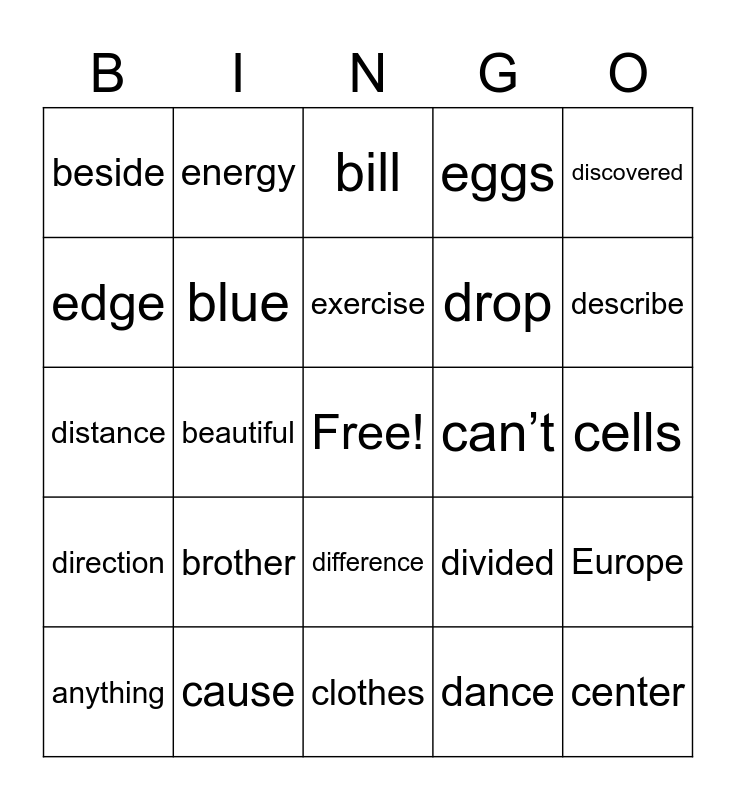 This bingo card has a free space and 29 words: anything, arms, beautiful, believe, beside, bill, blue, brother, can’t, cause, cells, center, clothes, dance, describe, developed, difference, direction, discovered, distance, divided, drive, drop, edge, eggs, energy, Europe, exercise and farmers.