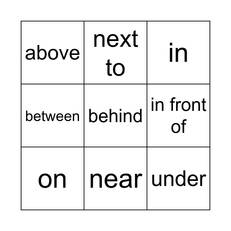This bingo card has 9 words: on, in, next to, between, above, in front of, behind, under and near.