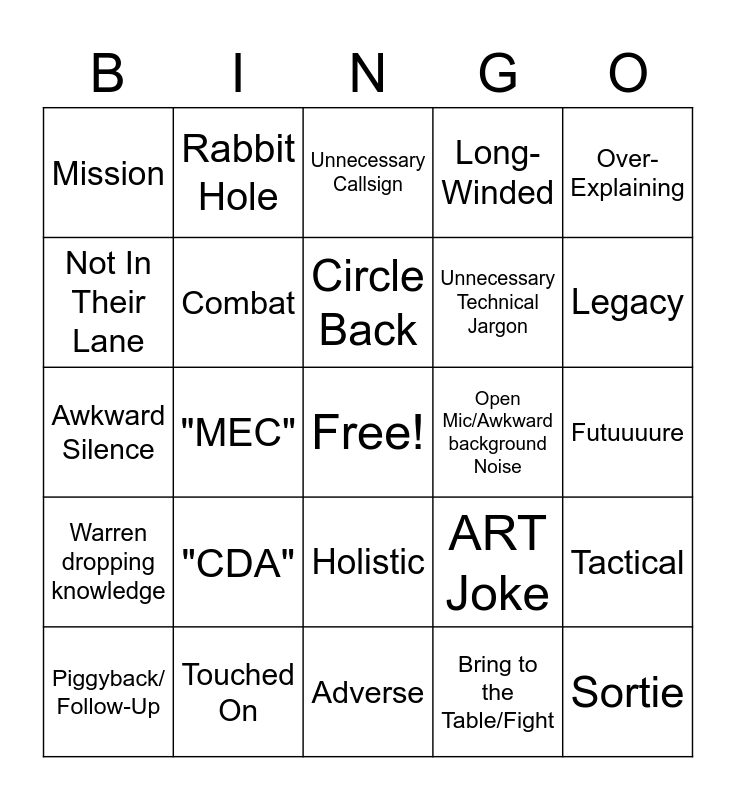 This bingo card has a free space and 24 words: "CDA", Touched On, Circle Back, Piggyback/ Follow-Up, Over-Explaining, Mission, Not In Their Lane, Rabbit Hole, Open Mic/Awkward background Noise, Holistic, Unnecessary Technical Jargon, Awkward Silence, ART Joke, Tactical, Combat, Bring to the Table/Fight, Futuuuure, Unnecessary Callsign, Legacy, "MEC", Sortie, Warren dropping knowledge, Long-Winded and Adverse.