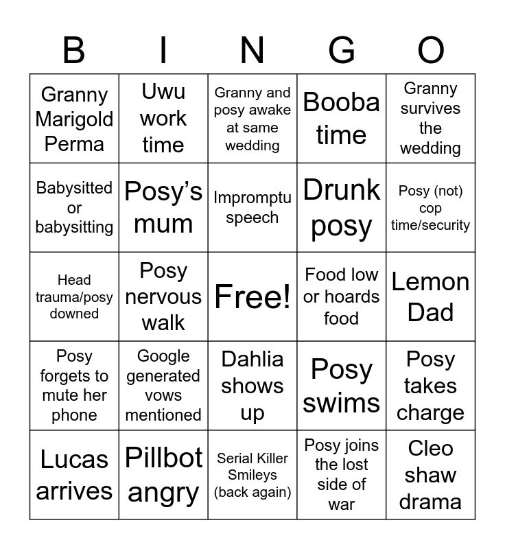 This bingo card has a free space and 29 words: Lucas arrives, Posy says the wrong name/vows, Posy nervous walk, Household Drama, Granny Marigold Perma, Granny and posy awake at same wedding, Posy’s mum, Google generated vows mentioned, Food low or hoards food, Pillbot angry, Lemon Dad, Cleo shaw drama, Serial Killer Smileys (back again), Posy joins the lost side of war, Posy (not) cop time/security, Posy wings the vows, Dahlia shows up, Posy forgets to mute her phone, Granny survives the wedding, Head trauma/posy downed, Posy swims, Posy punch, Drunk posy, Babysitted or babysitting, Booba time, Uwu work time, Posy takes charge, Impromptu speech and Babysitting or be babysitted.
