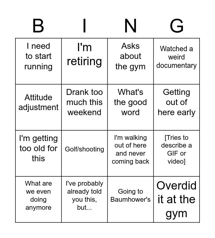 This bingo card has 16 words: I've probably already told you this, but..., [Tries to describe a GIF or video], Asks about the gym, I need to start running, I'm getting too old for this, I'm retiring, I'm walking out of here and never coming back, Going to Baumhower's, Attitude adjustment, Drank too much this weekend, What are we even doing anymore, Watched a weird documentary, Golf/shooting, Getting out of here early, What's the good word and Overdid it at the gym.