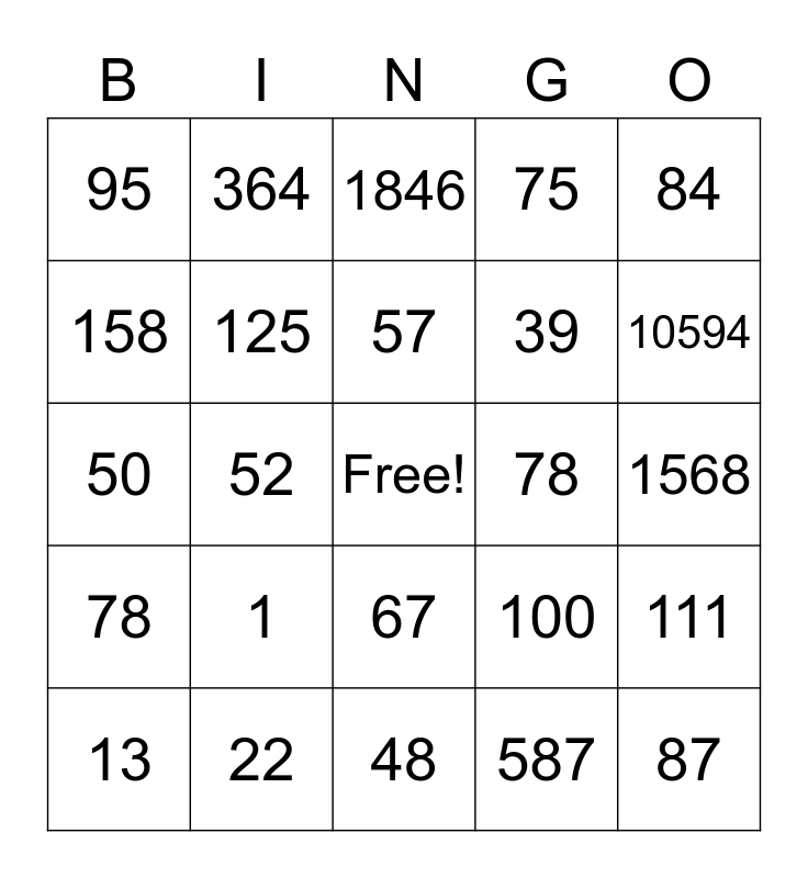 This bingo card has a free space and 24 words: 1, 22, 57, 13, 84, 95, 158, 364, 78, 67, 39, 50, 100, 111, 125, 587, 1568, 1846, 10594, 52, 87, 78, 75 and 48.