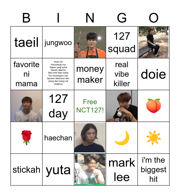 This bingo card has 9 images, a free space and 35 words: ty track, i'm the biggest hit, trendsetter, stickah, DAESANG, mark lee, yuta, 127 squad, haechan, let's love each other y'allπ PLEASEE, johnny, doie, jungwoo, jaehyun, sm's golden boys, taeil, million seller, π, π°, π±, π, πΉ, π, βοΈ, πΆ, π¦, 127 day, ilichil, 'di magiging sayo, nct garcia, money maker, favorite ni mama, real vibe killer, Ireoji ma Heundeulji ma Yejeon gatji anha Neodo aljanha Neo ireol ttae mada Tto muneojyeo nan Ijeneun dasineun deo isang deo isang nal chatjima and best boys.